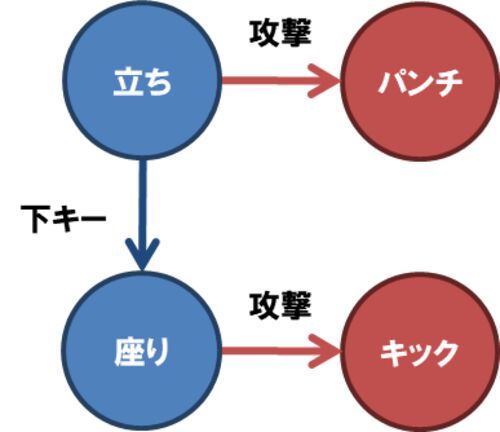 たまにはゲーム制作っぽいのも書く。 横スクロールの格ゲーっぽいゲームを作る時を考える。 このとき、攻撃ボタンを押すとパンチが出て、下キーを押してしゃがみながら攻撃するとキックが出るようにしたいとする。 面倒なのでコマンド攻撃とか諸々は考えない…